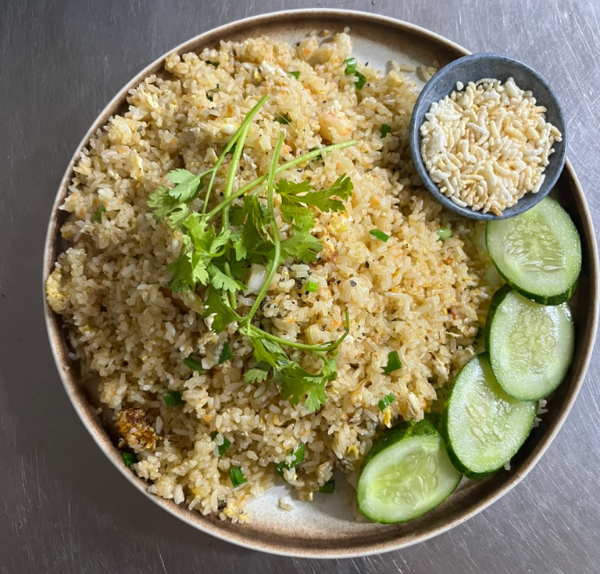 Điểm nhấn của món ăn là lớp trứng vàng óng quyện đều, kết hợp cùng hành lá, đậu Hà Lan, cà rốt tạo màu sắc hài hòa và hương vị cân bằng. Mỗi miếng cơm là sự hòa quyện giữa vị mặn mà của nước mắm, hương thơm nhẹ của tiêu và tỏi phi, tạo cảm giác đậm đà, lôi cuốn ngay từ miếng đầu tiên.